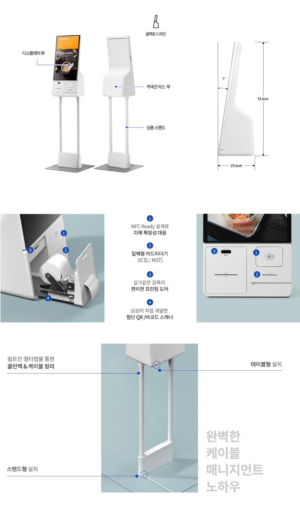 배리어프리 키오스크 장애인도 어려움 없이 사용 가능한 배리어프리 키오스크 21.5 인치 키오스크 + 멀티싸인패드 일체형 KPN-T6(B) / SM-E61P 장애인 차별 금지법 개정 25년 1월 28일부터 15평 이상 100인 미만 사업장 배리어프리 키오스크 설치 의무화 01 저자세 모드 컨트롤 지원 기능 (휠체어 탑승자, 사회적 약자) 02 고대비 모드의 사용 접근성 보장 (저시력자) 03 촉각 키패드와 음성 안내 기능 (시각장애인) 무인정보단말기 접근성 검증 기준 배리어프리 키오스크 필요 기능 확인 검증 기준 필요 기능 1. 손 또는 팔 동작 보완 모든 컨트롤 가이드 제공 2. 반응시간 보완 조작 시간제한 표시와 시간 연장 기능 알림 3. 시력 보완 및 대체 음성안내, 음성출력장치, 물리적 키패드, 고대비 화면, 낮은자세 모드, 쉬운 표준 모양 표시, 점자 레이블 제공 4. 색상 식별능력 보완 흑백 모니터에서 시각적 정보 구분 가능한 설계 5. 청력 보완 및 대체 음성, 음향 출력 내용을 시각/ 촉각적 대체 방법 제공 6. 음성 입력 대체 음성 입력 대체 수단 제공 7. 인지능력 보완 취소 및 초기화 기능, 알림정보 피드백, 단순하고 일관성 있는 가이드, 지원 도움 요청, 주문 정보 문자 표시 제공 8. 깜빡거림의 사용 제한 깜빡이거나 번쩍이는 화면 객체 제한 사용 9. 휠체어 사용자 접근 화면과 인터페이스 컨트롤 위치 준수 10. 개인정보 보호 개인정보 직접 설정 입력 및 등록정보 표시 제한 POINT 01 저자세 모드 컨트롤 지원 기능 휠체어 탑승자, 사회적 약자를 위한 저자세 모드(낮은 화면 모드)는 모든 컨트롤이 가능하도록 세팅되어야 합니다 저자세 모드 화면 POINT 02 고대비 모드의 사용 접근성 보장 저시력자, 노인을 고려한 고대비 모드는 대비 색상 화면, 직관적인 아이콘, 음성 안내를 제공합니다. 고대비 모드 화면 POINT 03 촉각 키패드와 음성 안내 기능 방향이동 키패드를 통한 메뉴 선택이 가능하며 이어폰을 연결 시 음성안내 기능을 지원합니다. POINT 04 배리어프리 키오스크 특징 판매를 높이는 맞춤형 메뉴 이미지 (토핑 주문화면 제공) 다국어 UI와 음성 지원 (한국어, 영어) 다양한 업종에도 설치 가능한 솔루션 적용 조립 간소화 설계로 설치 시간 단축 원하는 멀티패드 장착 가능 A/S가 편리한 모듈형 구조 POINT 05 모든 결제 수단 지원 결제 서비스에 불편함이 없도록 모든 결제 수단을 지원합니다. 컨택리스 애플페이 네이버페이 카카오페이 삼성페이 제로페이 알리페이 위쳇페이 마스터 아멕스 페이북 VISA 신용카드 체크카드 현금영수증 택스리펀드 은련카드 지역화폐 컨택리스 애플페이 네이버페이 카카오페이 삼성페이 제로페이 알리페이 위쳇페이 마스터 아멕스 페이북 VISA 신용카드 체크카드 현금영수증 택스리펀드 은련카드 지역화폐 POINT 06 3인치 영수증 자동 커팅 기능 가장 보기 편한 3인치 영수증과 깔끔 인쇄 출력이 가능한 자동 컷팅 장비가 내장 되어있어 오래 사용이 가능합니다. POINT 07 다양한 고객 호출 기능 제공 고객이 주문한 메뉴가 준비되면 다양한 방식으로 알림 메시지를 발송할 수 있습니다 주문번호 호출 카카오 알림톡 호출 진동벨 호출 주문번호 호출 카카오 알림톡 호출 진동벨 호출 고객 포인트 적립과 할인 프로모션 기능도 쉽게 사용할 수 있습니다 쿠폰 적용 포인트 적립 할인 프로모션 POINT 08 매장관리 필수 앱 ‘캐시노트’ 매출 연동 매장 운영과 매출 관리 기능을 캐시노트에서 무료로 사용해 보세요. 캐시노트 앱 연동 매출 장부 실시간 매출 판매 관리 매출 분석 제품 스펙 결제 기능에 부족함이 없는 장비 스펙 다른 키오스크 기능도 비교해보세요! 01 올인원 결제 수단 지원 02 메뉴별 타임 설정 기능 03 실시간 통합 매출 관리 04 복수 사업자 메뉴 사용 기능 KPN 배리어프리 키오스크 제품명 KPN 배리어프리 키오스크 사이즈(데스크형) 데스크형 가로328x세로306x높이769mm / 무게 16kg 사이즈(스탠드형) 스탠드형 가로400x세로400x높이1536mm / 무게 31kg 구성 키오스크(21.5인치), 멀티싸인패드 내장형(애플페이 가능), 전용 케이블, 전표용지(3인치 감열지), 사용설명서 배리어프리 키오스크 H/W 사양 KPN-T6(B) 디스플레이 21.5인치LED 백라이트정전형멀티터치(FHD / 해상도1080 x 1920) 프로세서 인텔® 셀러론® 프로세서J6412 (Fanless) 저장장치 SSD 128GB (복구솔루션탑재) 메모리 4GB 그래픽 인텔® 통합그래픽 프린터 3인치감열식영수증프린터(출력속도: 200mm/sec max. 오토커터) 스피커 5W (내장형) I/O 포트 USB 6, LAN 1(RJ45) Serial 6(DB9x3, RJ50x2, RJ11x1) 운영체제 Windows 10 IoT Enterprise, Windows 11 (라이선스포함) S/W UP키오스크(KIOSK 전용솔루션탑재/ 라이선스포함) 전원 12V/5A, 24V/1.75A 인증 KC(R-R-P2C-K21T6) KPN-T6(B) 디스플레이 21.5인치LED 백라이트정전형멀티터치(FHD / 해상도1080 x 1920) 프로세서 인텔® 셀러론® 프로세서J6412 (Fanless) 저장장치 SSD 128GB (복구솔루션탑재) 메모리 4GB 그래픽 인텔® 통합그래픽 프린터 3인치감열식영수증프린터(출력속도: 200mm/sec max. 오토커터) 스피커 5W (내장형) I/O 포트 USB 6, LAN 1(RJ45) Serial 6(DB9x3, RJ50x2, RJ11x1) 운영체제 Windows 10 IoT Enterprise, Windows 11 (라이선스포함) S/W UP키오스크(KIOSK 전용솔루션탑재/ 라이선스포함) 전원 12V/5A, 24V/1.75A 인증 KC(R
